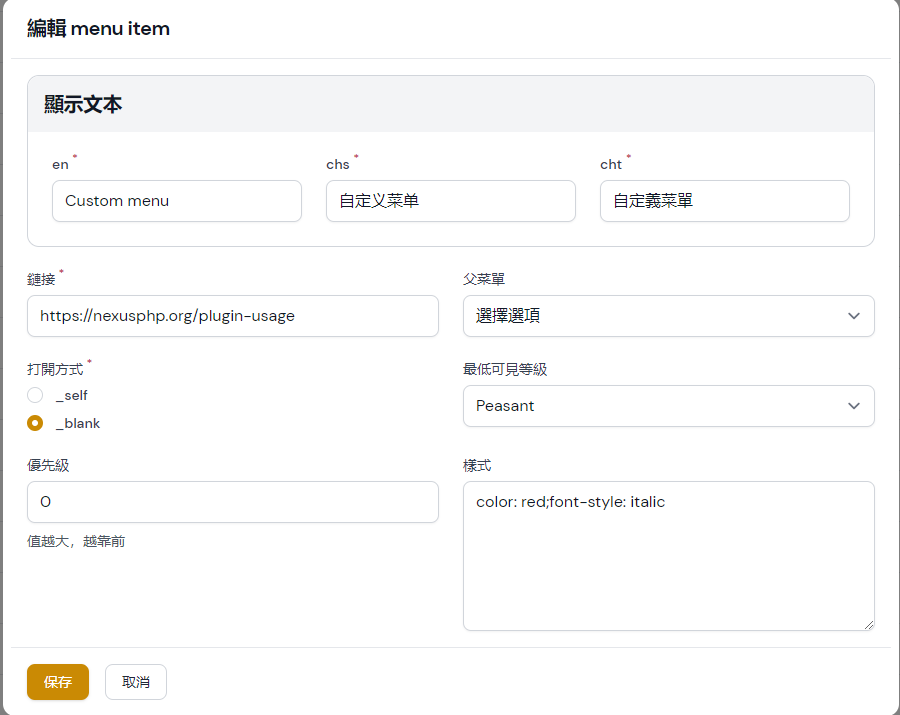 安装后可在管理后台编辑菜单项。支持多层级、多语言,可以设定优先级、打开方式、可见性,以及设置额外的样式。